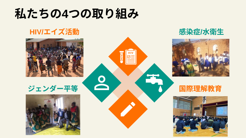 ①HIV/エイズ支援②感染症・水衛生 ③ジェンダー平等④国際理解教育(日本国内)